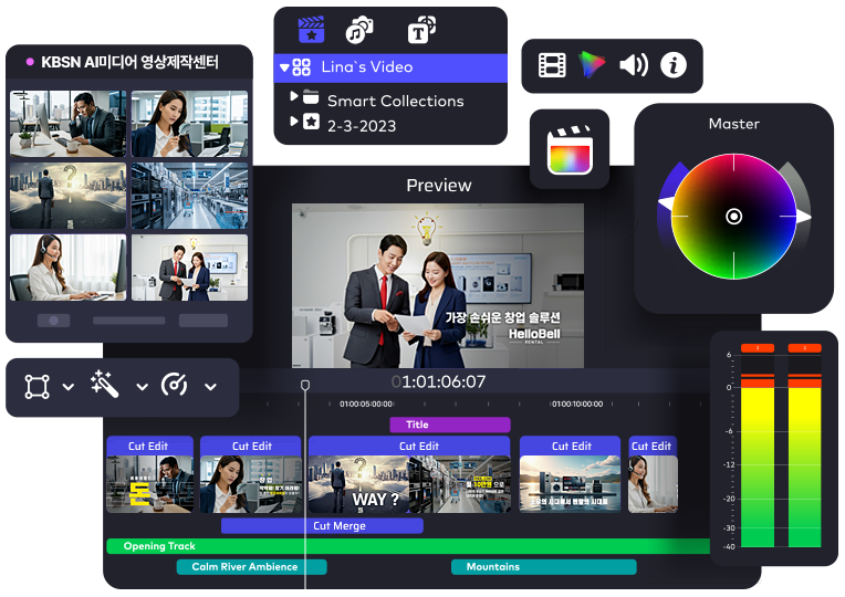 영상 편집프로그램을 통해 TV영상 컨셉에 맞는 사운드(BGM, 나레이션, 효과음) 생성, 영상 제작 완성도를 위한 영상 후보정 수정 작업에 들어갑니다. 4K(UHD)로 업스케일링하고, 노이즈를 제거(Denoising) 합니다.